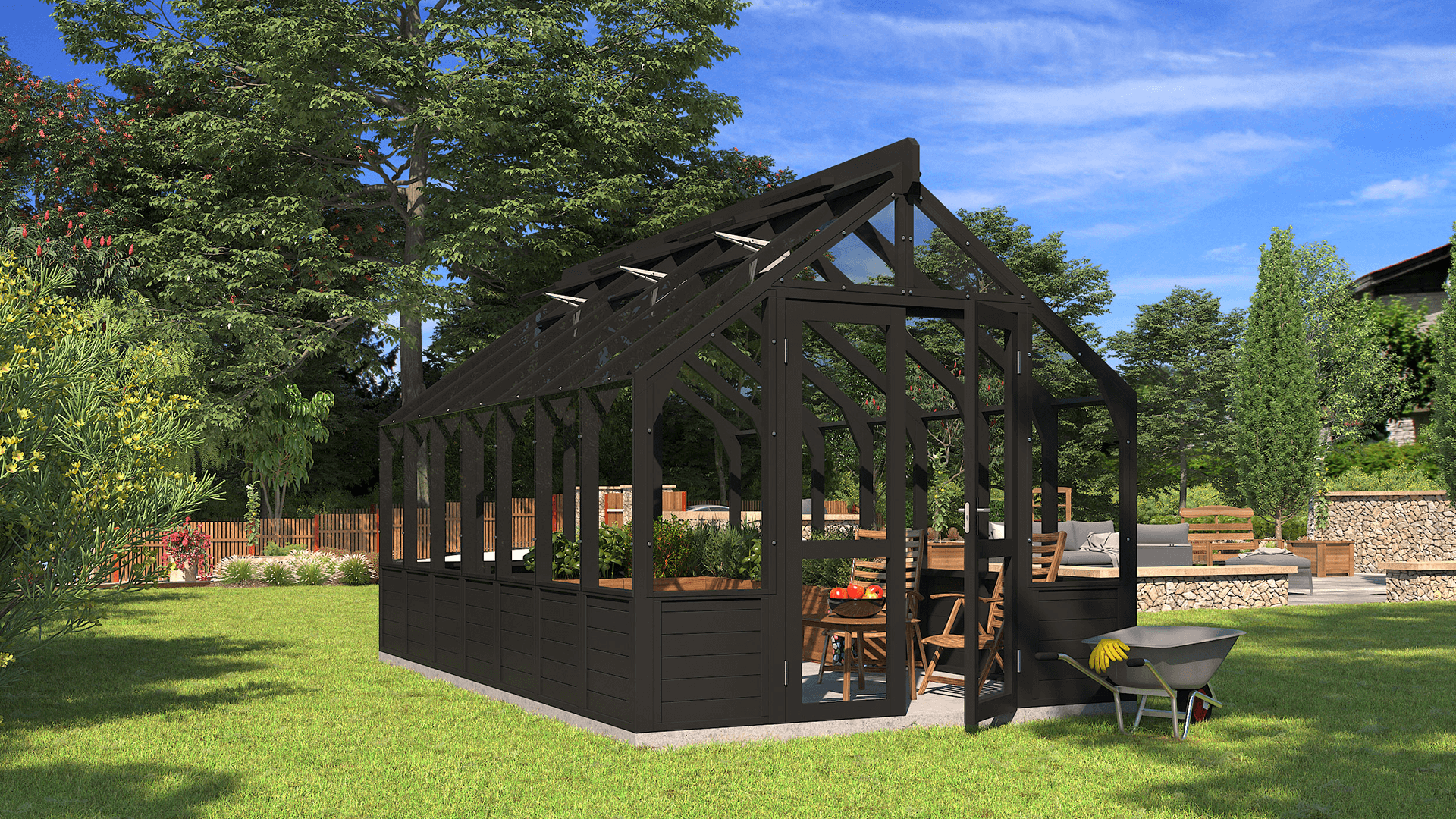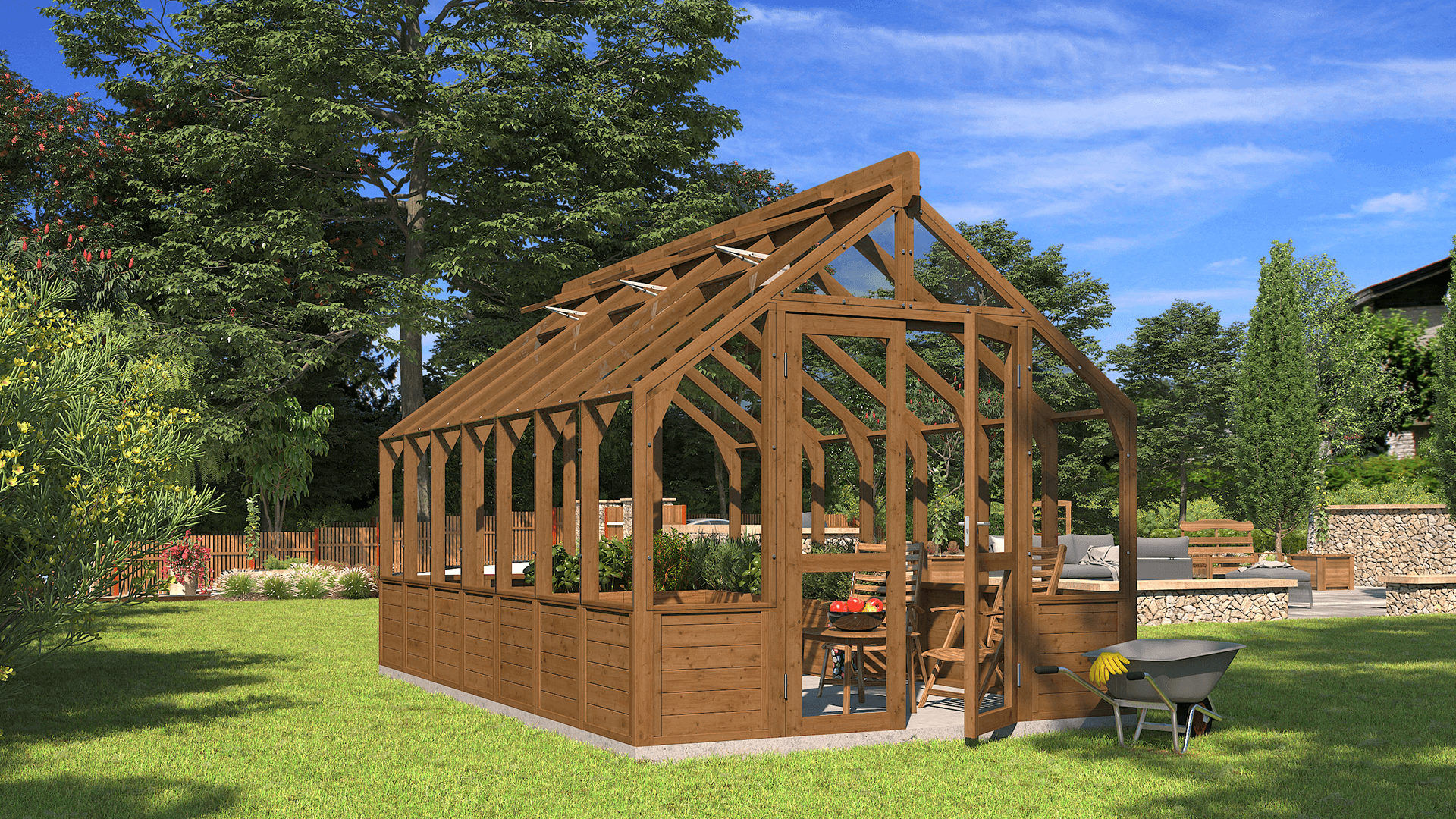 Uusiutuvista materiaaleista valmistetut ja vuosikymmeniksi suunnitellut puiset kasvihuoneemme ilmentävät kestävän käsityön periaatteita ja vastuullista suhtautumista ympäristöön.