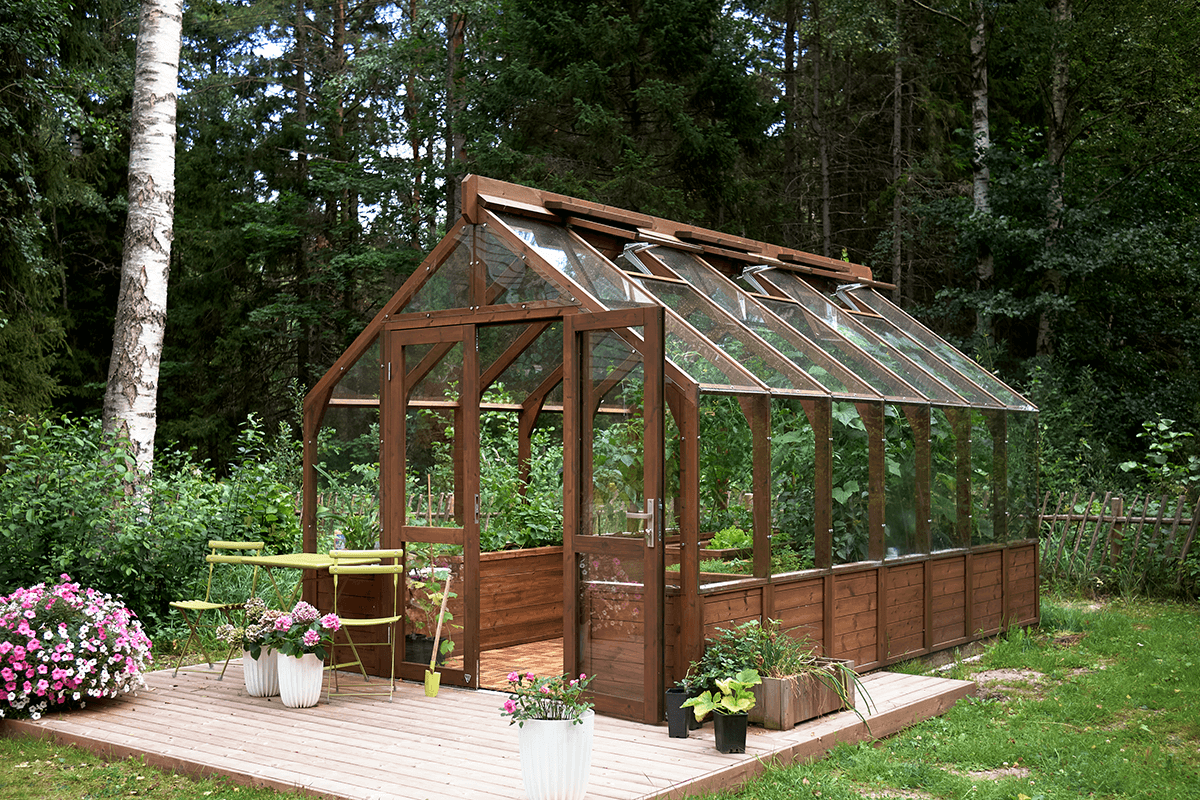 Kasvihuoneen runko on valmistettu kestävästä suomalaisesta lämpöpuusta.