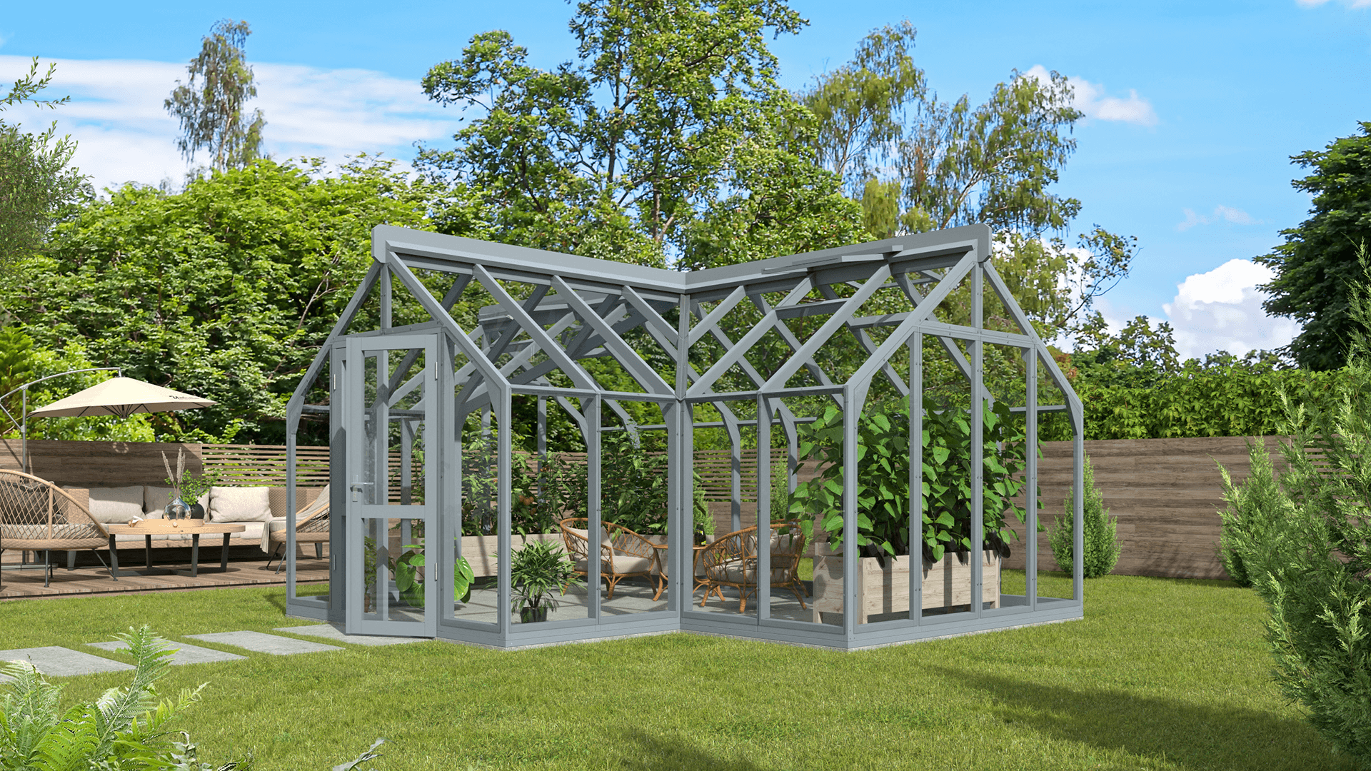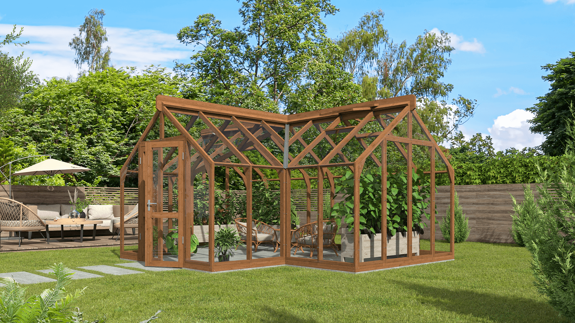 Uusiutuvista materiaaleista valmistetut ja vuosikymmeniksi suunnitellut puiset kasvihuoneemme ilmentävät kestävän käsityön periaatteita ja vastuullista suhtautumista ympäristöön.