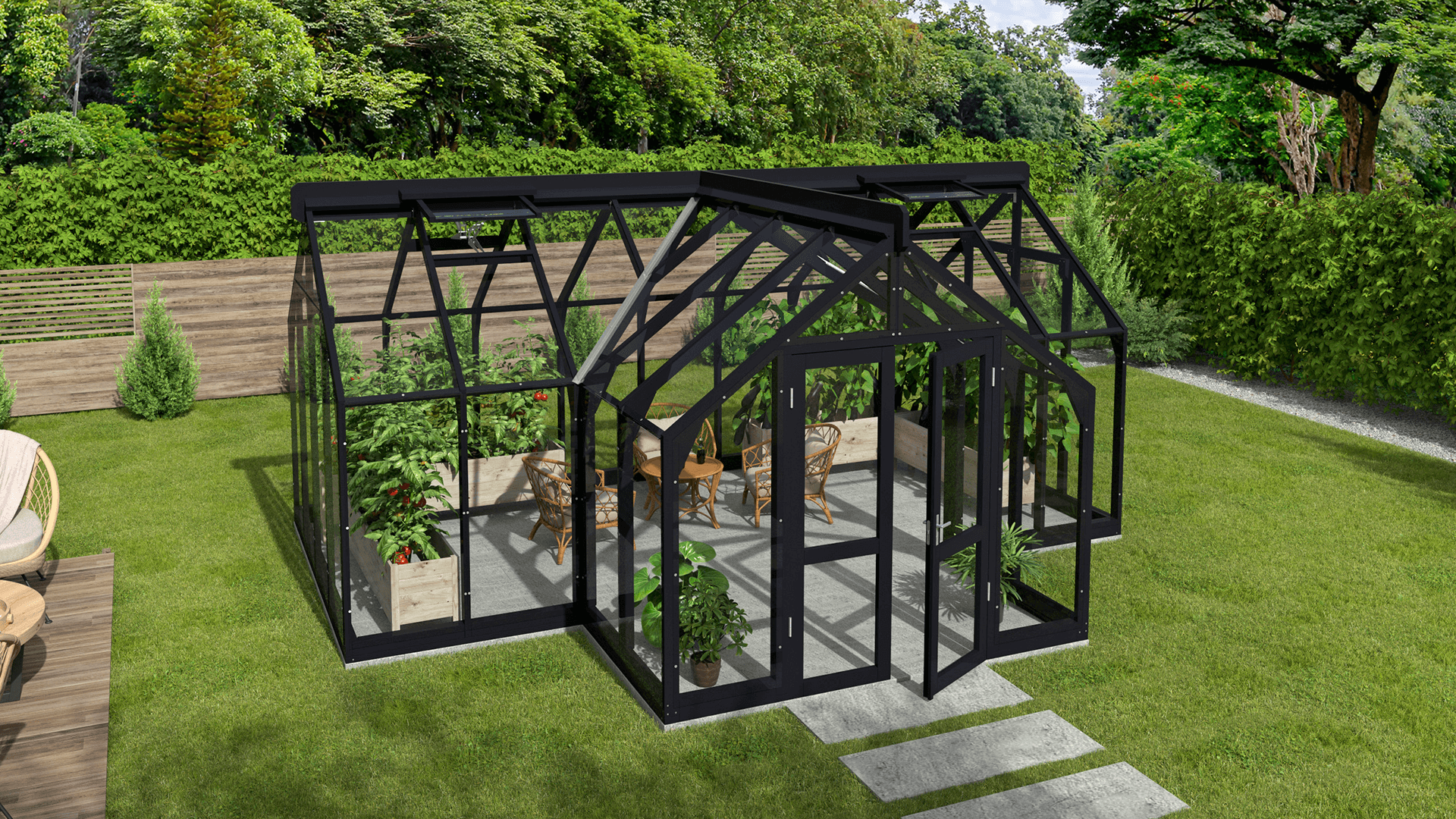 Kasvihuoneessa on leveä kaksoisovi (140 cm) ilman kynnystä.
