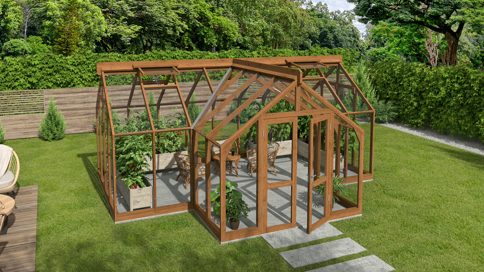 Lähe puinen kasvihuone ei ole tarkoitettu ainoastaan kasvien kasvattamiseen – se voi toimia myös kauniina puutarhapaviljonkina, jossa rentoudutaan vehreyden keskellä, nautitaan aterioista tai kestitään vieraita. Puun luonnollinen lämpö luo kodikkaan ja kutsuvan tunnelman ja tekee kasvihuoneesta elegantin oleskelutilan. Käytä sitä rauhallisena lepopaikkana, kesäisenä ruokailutilana tai luovana työtilana – se mukautuu jokaiseen vuodenaikaan ja tilaisuuteen. Se on paikka, jossa aika saa pysähtyä.