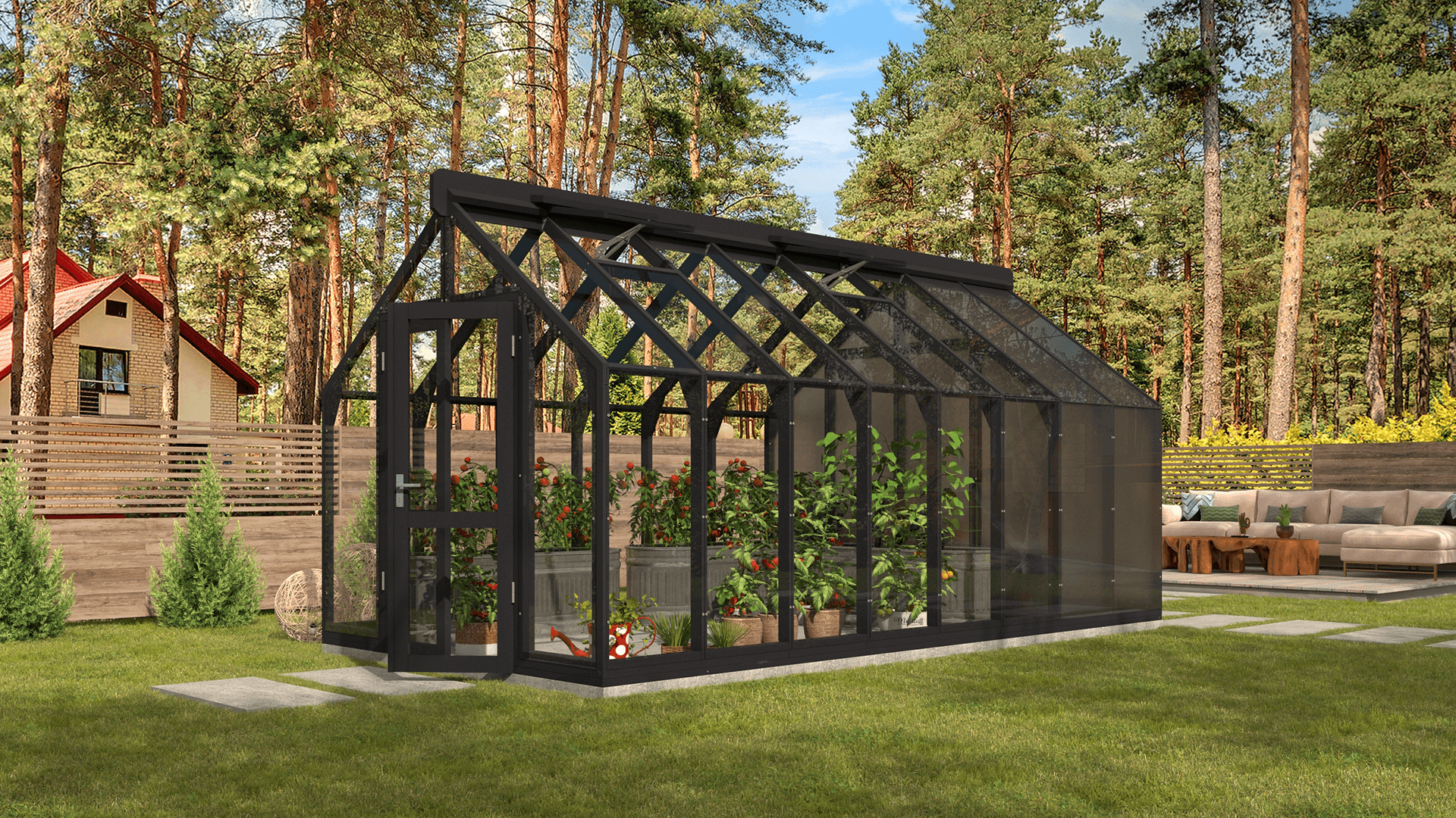 Kasvihuone SG 3 on kokonaan lasitettu vahvalla 4 mm karkaistulla turvalasilla.