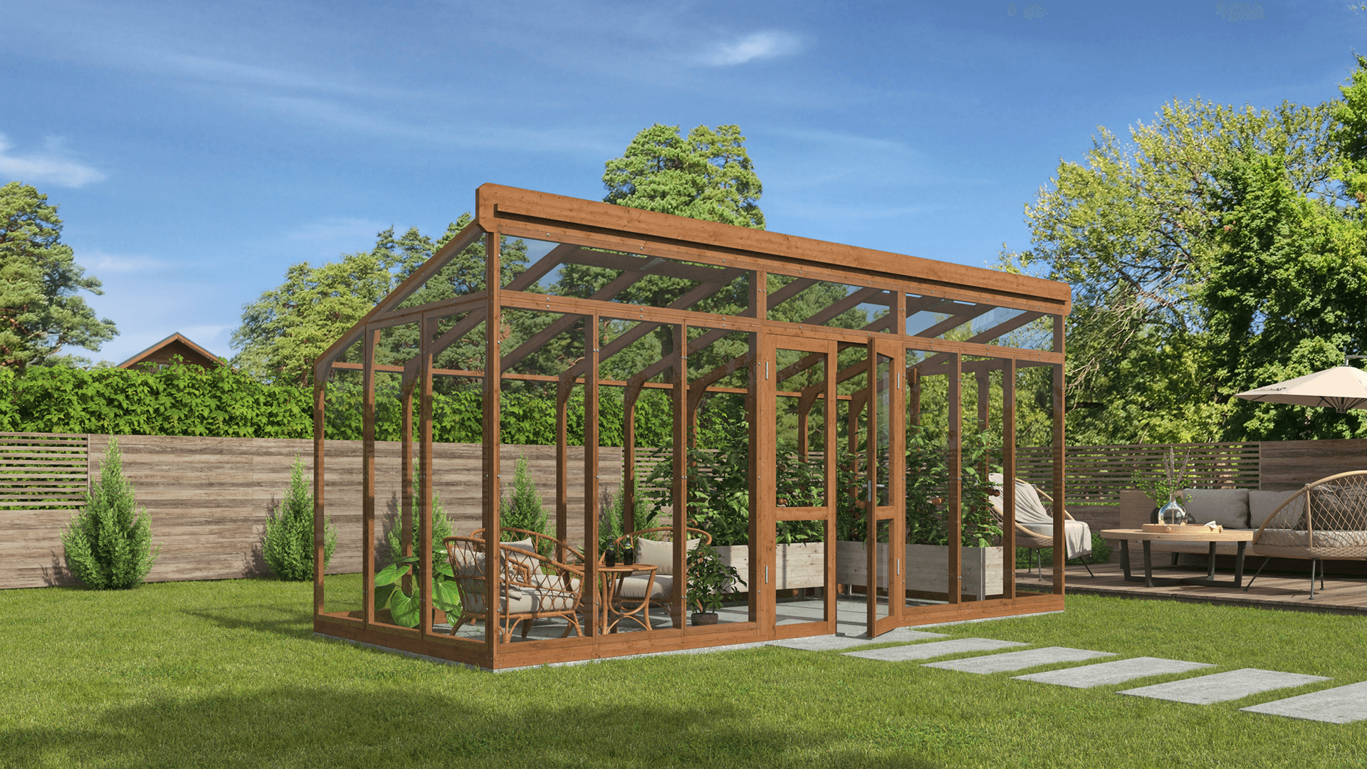 Lähe puinen kasvihuone ei ole tarkoitettu ainoastaan kasvien kasvattamiseen – se voi toimia myös kauniina puutarhapaviljonkina, jossa rentoudutaan vehreyden keskellä, nautitaan aterioista tai kestitään vieraita. Puun luonnollinen lämpö luo kodikkaan ja kutsuvan tunnelman ja tekee kasvihuoneesta elegantin oleskelutilan. Käytä sitä rauhallisena lepopaikkana, kesäisenä ruokailutilana tai luovana työtilana – se mukautuu jokaiseen vuodenaikaan ja tilaisuuteen. Se on paikka, jossa aika saa pysähtyä.