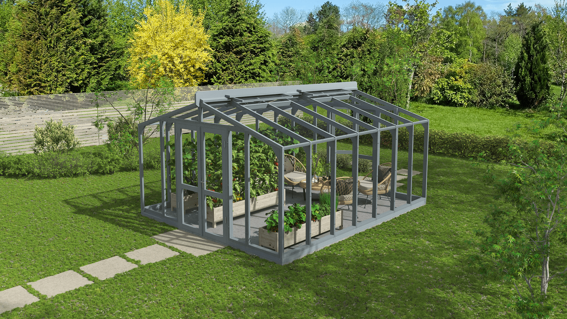Lähe puinen kasvihuone ei ole tarkoitettu ainoastaan kasvien kasvattamiseen – se voi toimia myös kauniina puutarhapaviljonkina, jossa rentoudutaan vehreyden keskellä, nautitaan aterioista tai kestitään vieraita. Puun luonnollinen lämpö luo kodikkaan ja kutsuvan tunnelman ja tekee kasvihuoneesta elegantin oleskelutilan. Käytä sitä rauhallisena lepopaikkana, kesäisenä ruokailutilana tai luovana työtilana – se mukautuu jokaiseen vuodenaikaan ja tilaisuuteen. Se on paikka, jossa aika saa pysähtyä.